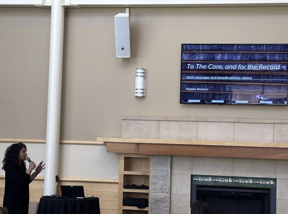 Natalie Romero (Art and Design) presented on an original multimedia installation that incorporated 200 million years of data from New Jersey (plant species from Rutgers EcoPreserve; geologic cores from Rutgers Newark Basin Coring Project; and sea level trends for Sandy Hook) into sound recordings, along with video projection, screens and photography to “counter-archive conveying indigenous history and ways of relating to the Earth.”