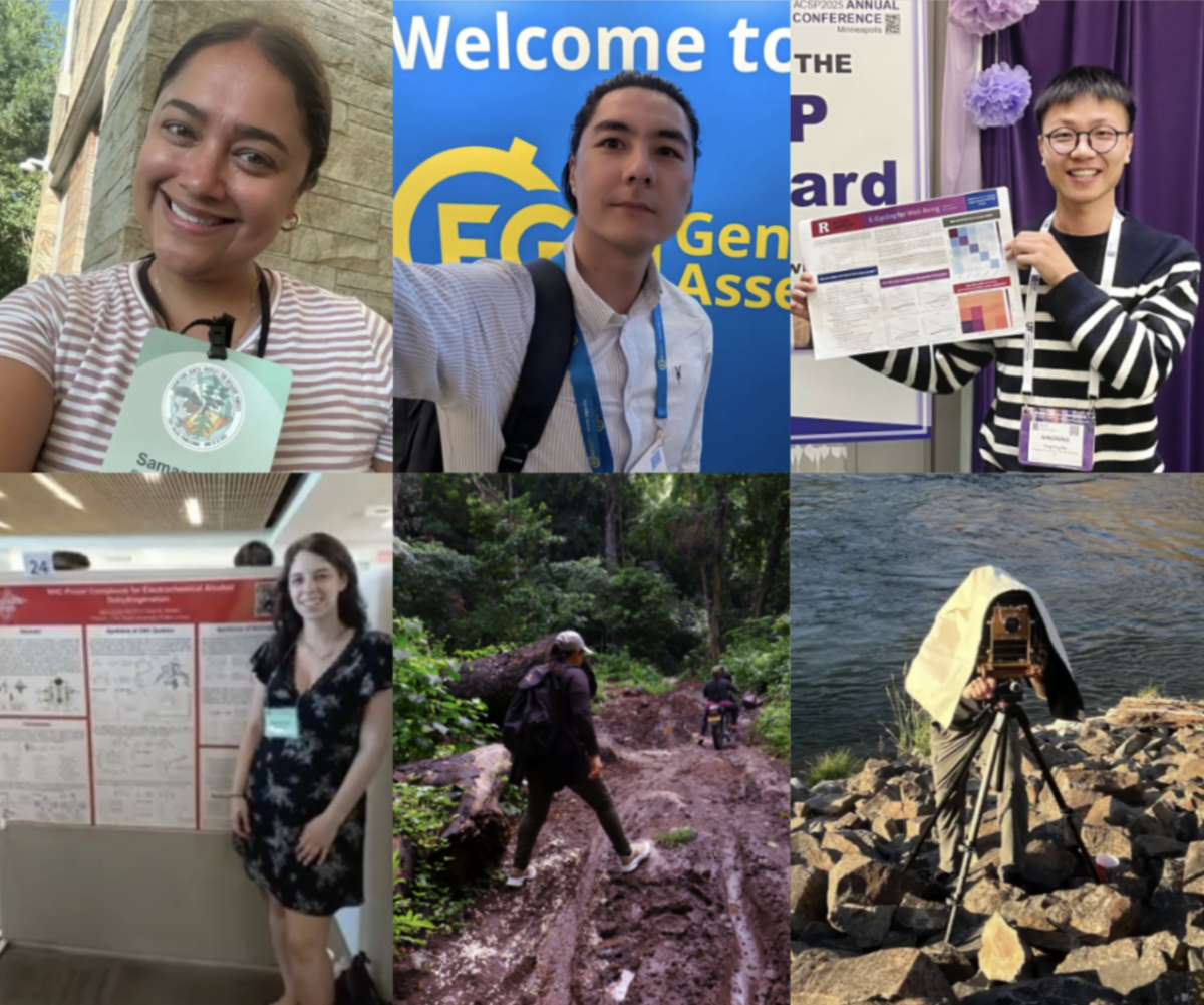 Bottom row: Alex Corral, Ph.D. candidate in Chemistry and Chemical Biology, presented research on catalysts for converting alcohols from biomass into sustainable fuels and chemicals at the Organometallic Chemistry Gordon Research Conference in Newport, Rhode Island. Daniela Mosquera-Camacho, Ph.D. student in Geography, studied coal mining in Cesar, Colombia, exploring its cultural, economic, and social impacts. Andrew Jarman, MFA candidate in Visual Art, is documenting Palm Springs’ Prescott Preserve and Oregon’s Deschutes River to explore human interaction with landscapes through photography.