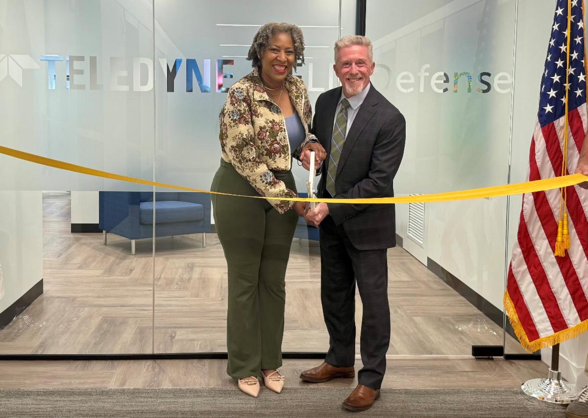 | Office manager Michele Robertson and VP of US Business Development David Viens cut the ceremonial ribbon on the new Teledyne FLIR Defense ‘Experience Center’ in Arlington. |