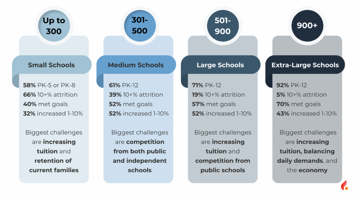 The difference between large and small schools' performance indicates that size may increasingly matter in the current environment. Small schools face the dual challenge of higher attrition rates and greater difficulty meeting enrollment goals, while larger schools demonstrate more stability and success in achieving their targets.