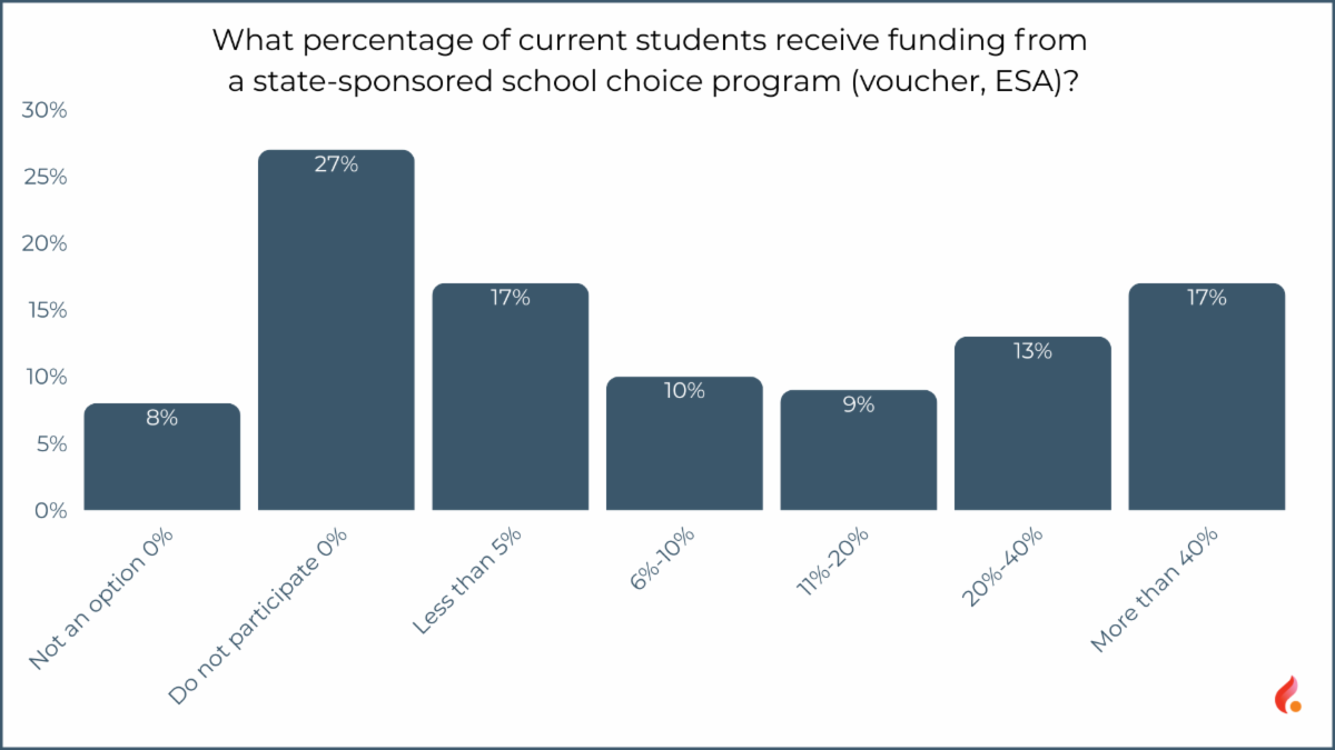 Schools with high student participation rates (20-40%) in school choice programs increased from 4% to 13%, while those with 40% or higher participation more than tripled from 5% to 17%. Notably, smaller schools show the highest voucher and ESA participation rates, with 28% of small schools reporting that more than 40% of their students receive funding from state-sponsored school choice programs, doubling the 14% reported in 2024.