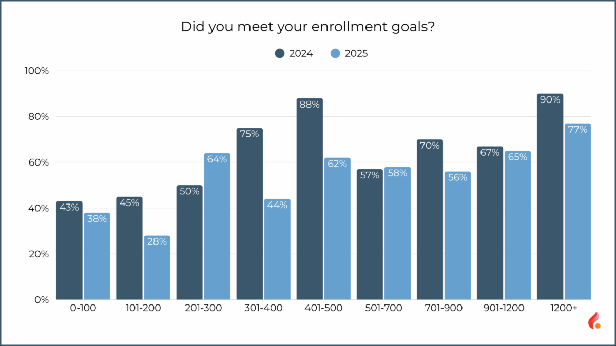 School size appears to be a contributing factor in enrollment success. Extra-large schools (over 900 students) demonstrated the strongest performance, with 70% meeting their enrollment goals, while small schools (under 300 students) struggled most, with only 40% achieving their targets, suggesting that larger schools may have the resources and stability to weather current market challenges.