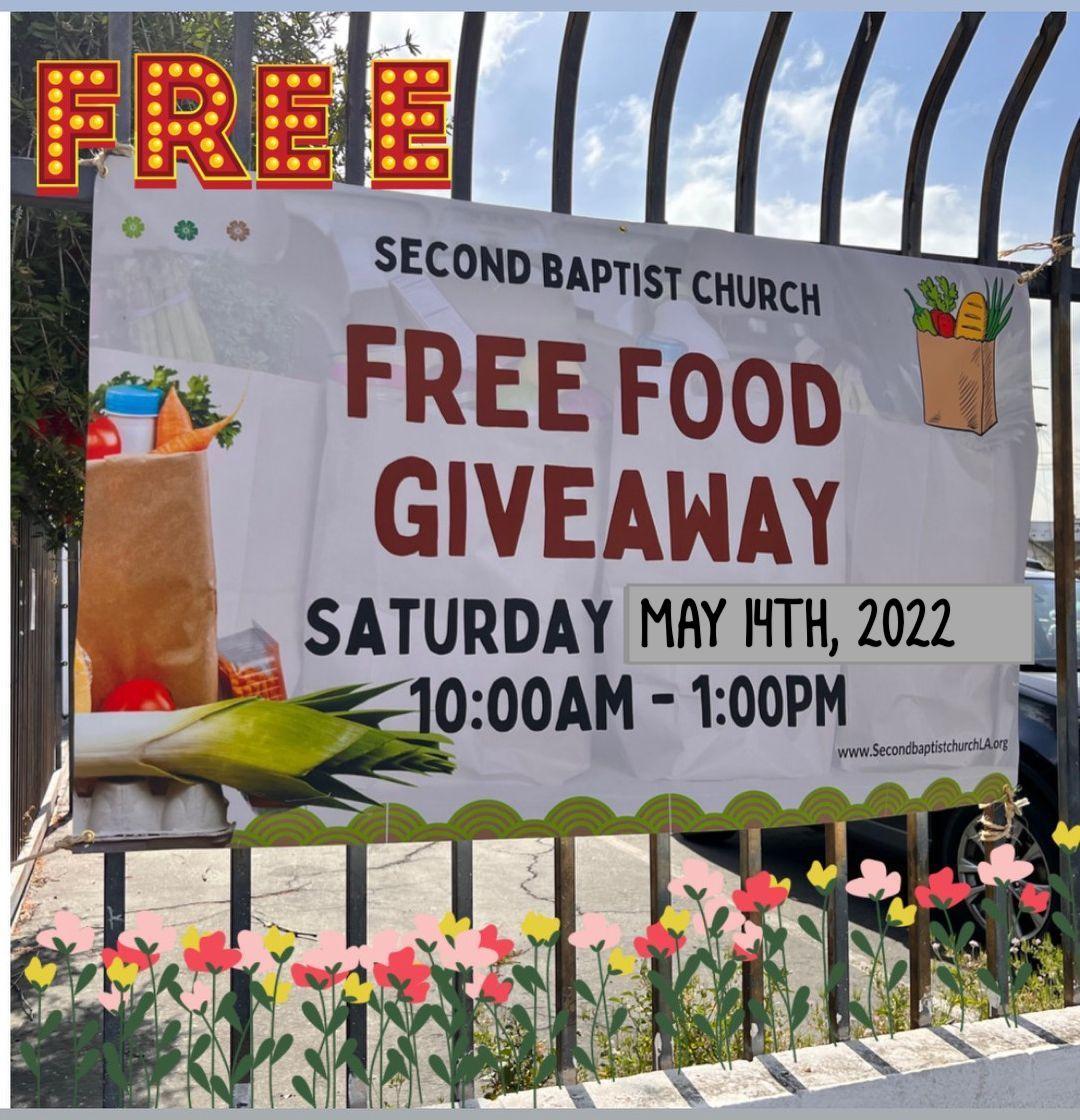 Second Baptist Church has partnered with the Los Angeles Food Bank to host 2 food giveaways a month, on the 2nd and 4th Saturday of each month. The next food giveaway will be held Saturday, May 14th from 10:00 AM - 1:00 PM. Volunteers are needed, specifically those who can lift medium-sized boxes. If you'd like to volunteer for this giveaway or future giveaways, please send an email to sbclanews@gmail.com and your name will be forwarded to Ella Quinlan-Oatis and Jackie McMahon.