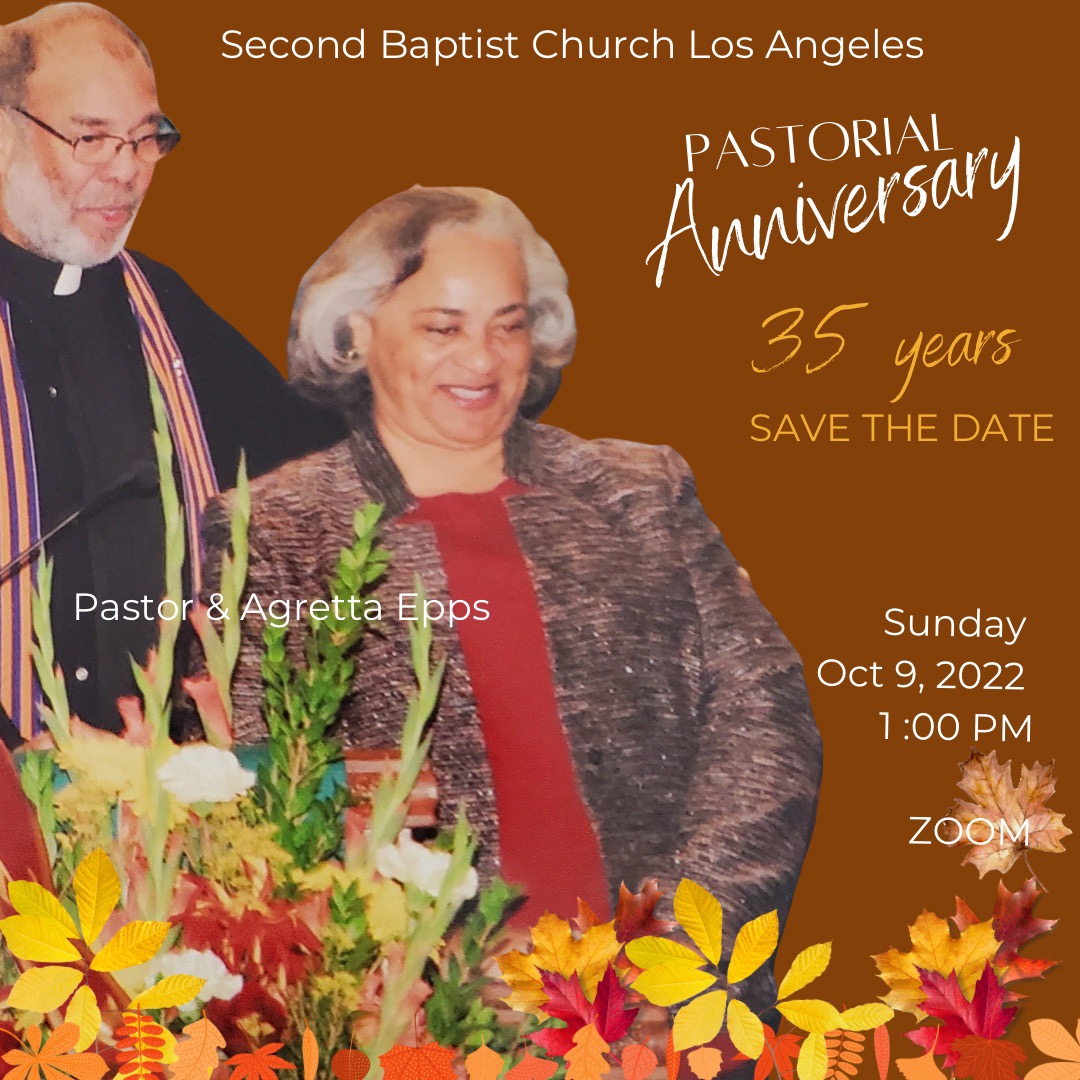 On Sunday October 9th, Second Baptist will celebrate the 35th Anniversary of Pastor William & First Lady Agretta Epps. The contact information for our Zoom Celebration is below. We hope the entire congregation will join in the Zoom Celebration. We encourage you to show your affection and appreciation for our Pastor & First Lady by using the blue envelope in your packet, through Givelify or by sending a card. We will have a “Love Gift Box” for cards at the Worship Service at Mt. Gilead on October 9th. See everybody on the Zoom Celebration at 1:00 PM!