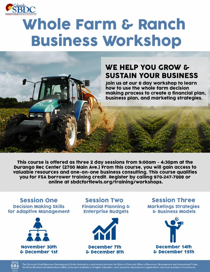 The SBDC, in conjunction with Whole New Concepts, will be offering an intensive business planning and strategy series called "Whole Farm and Ranch Business Series" beginning in late November in Durango. See below for more details. Scholarships will be available to agriculture businesses for this class. All businesses are welcome as curriculum can be modified for non-agriculture businesses.