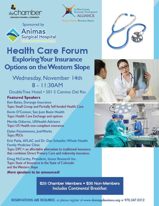 The Southwest SBDC will be participating in a statewide initiative to provide more health, safety and wellness resources to Colorado small businesses. To kick this off, we hosted a free workshop to help businesses understand the ACA changes and what's available on the healthcare market. Coming later this year, we will host a 3-part series on supporting mental "wealth" in the workplace. The Durango Chamber and the La Plata Economic Alliance will be co-hosting a Health Care Forum on November 14. See the flyer below.