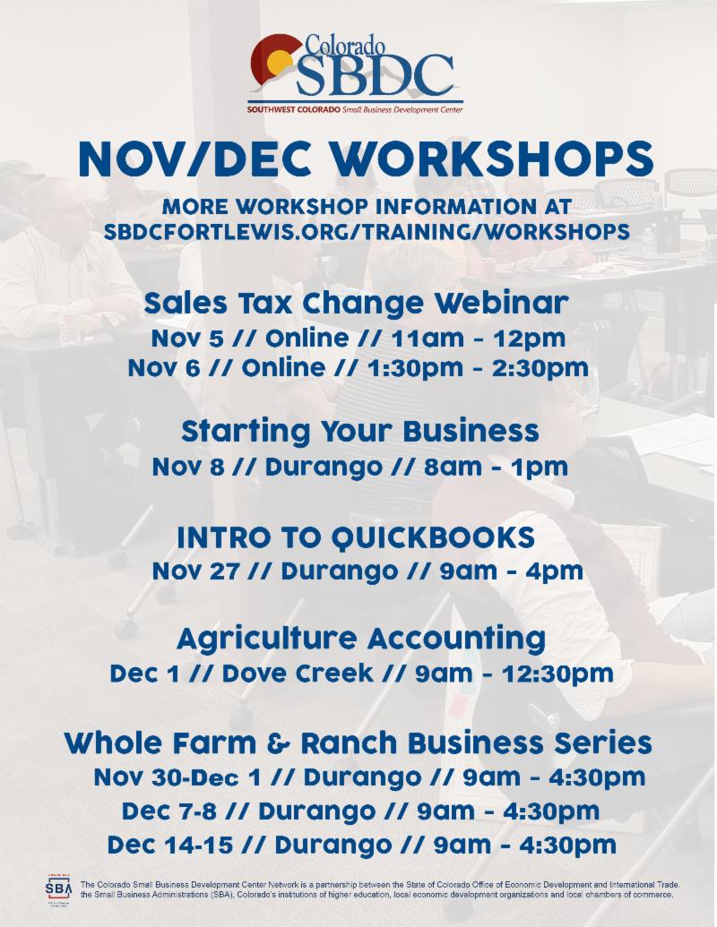 Our next Starting Your Business workshop is scheduled for November 8 at the Durango Library. Spread the word to anyone you know who might be thinking about starting or buying a business in the near future. Thanks to 1st Southwest Bank for sponsoring these classes! A link to the registration page with