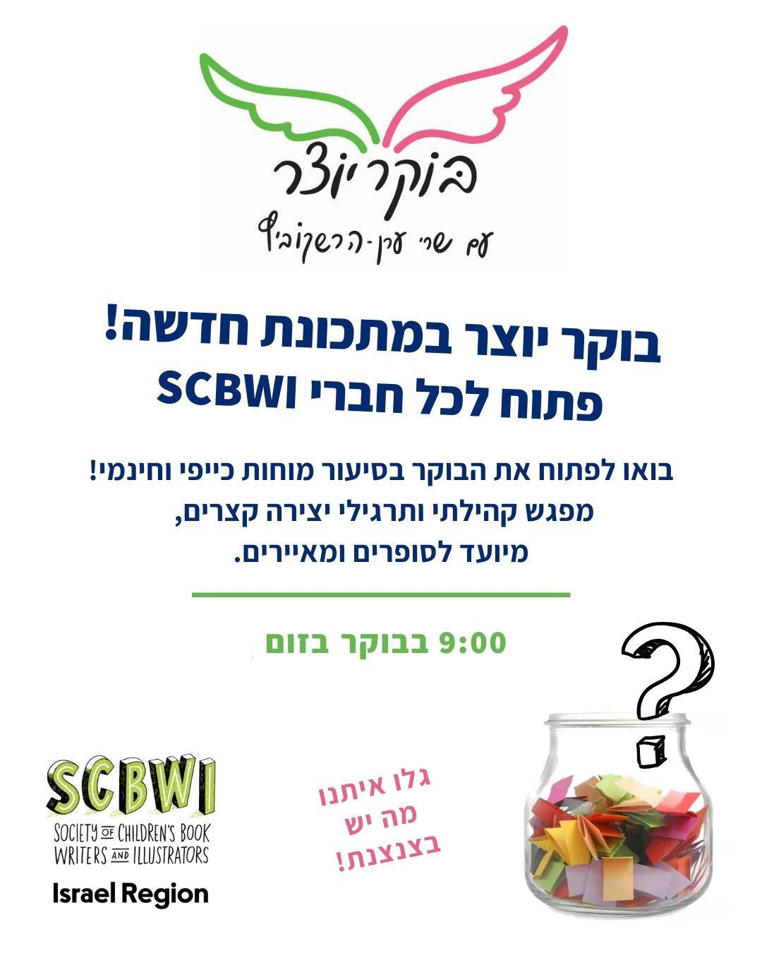 18 Jan 9:00AM Israel Time - Creative morning with Sari Eran Herskovitz Come and brainstorm with us in fun and heartwarming get together- for writers and illustrators, In Hebrew. free! All information be shared in the dedicated WhatsApp group