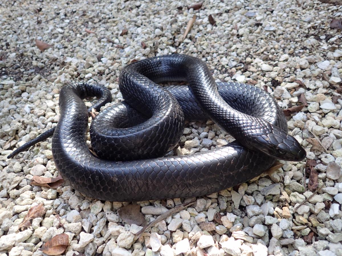 The most common snake on the island and in South Florida, the Southern black racer (Coluber constrictor), is often mistaken for Eastern indigo snakes simply because they are black. However, the average size of the Southern black racer on the islands is two-and-a-half to three-and-a-half feet, and they are much thinner than indigos. Black racers are more nervous and less tolerant of human interference and will dart at the first opportunity.
