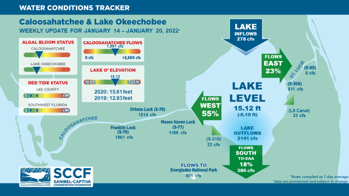 On 1/20/22 Lake Okeechobee was at 15.12 feet, decreasing by 0.10 feet in the past week. The weekly average flow at S-79 was 1,961 cfs (cubic feet per second) and flow from the Lake at S-77 was an average of 1,189 cfs. The 14-day average flow on 1/20/22 was 2,025 cfs and has been in the optimal flow envelope for 57 days.