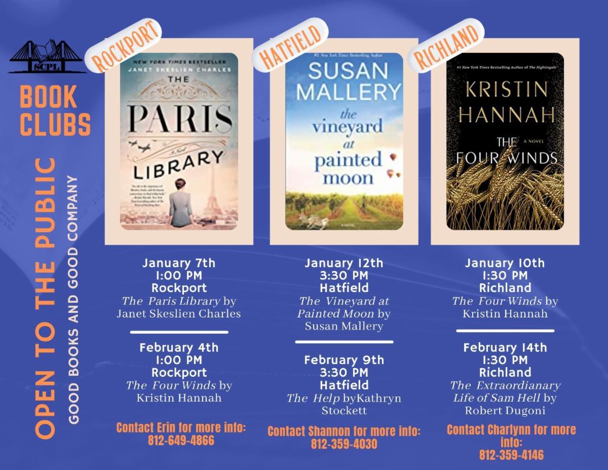 The Book Club at Rockport meets the first Friday of every month at 1:00 PM. You can join virtually or at the Main Library in Rockport. For more information please contact Erin by calling 812-649-4866.