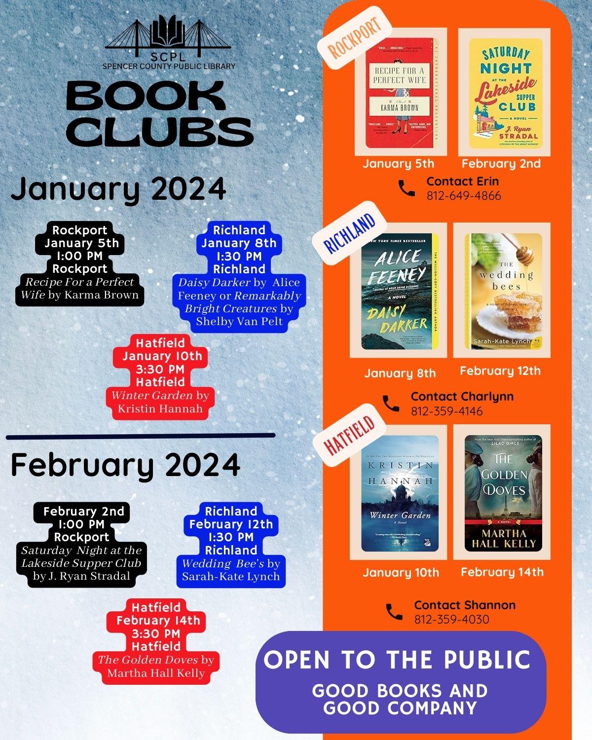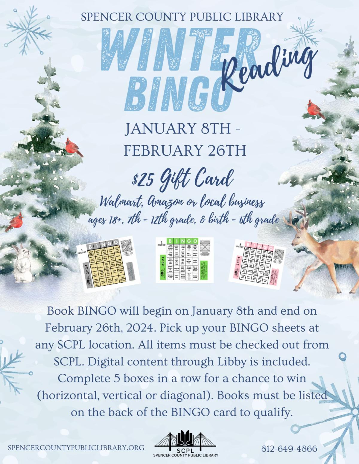 Book BINGO will begin on January 8th, 2024, and end on February 26th, 2024. Pick up your BINGO sheets at any SCPL location. All items must be checked out from a SCPL location. Digital content through Overdrive and Libby is included. Horizontal, vertical, and diagonal lines will count as an entry into the prize drawing. Complete 5 boxes in a row for a chance to win. Multiple entries will be accepted. Books must be listed on the back of the BINGO card to qualify. Please turn in your BINGO sheet at any SCPL location by closing time on Monday, February 26th. | |