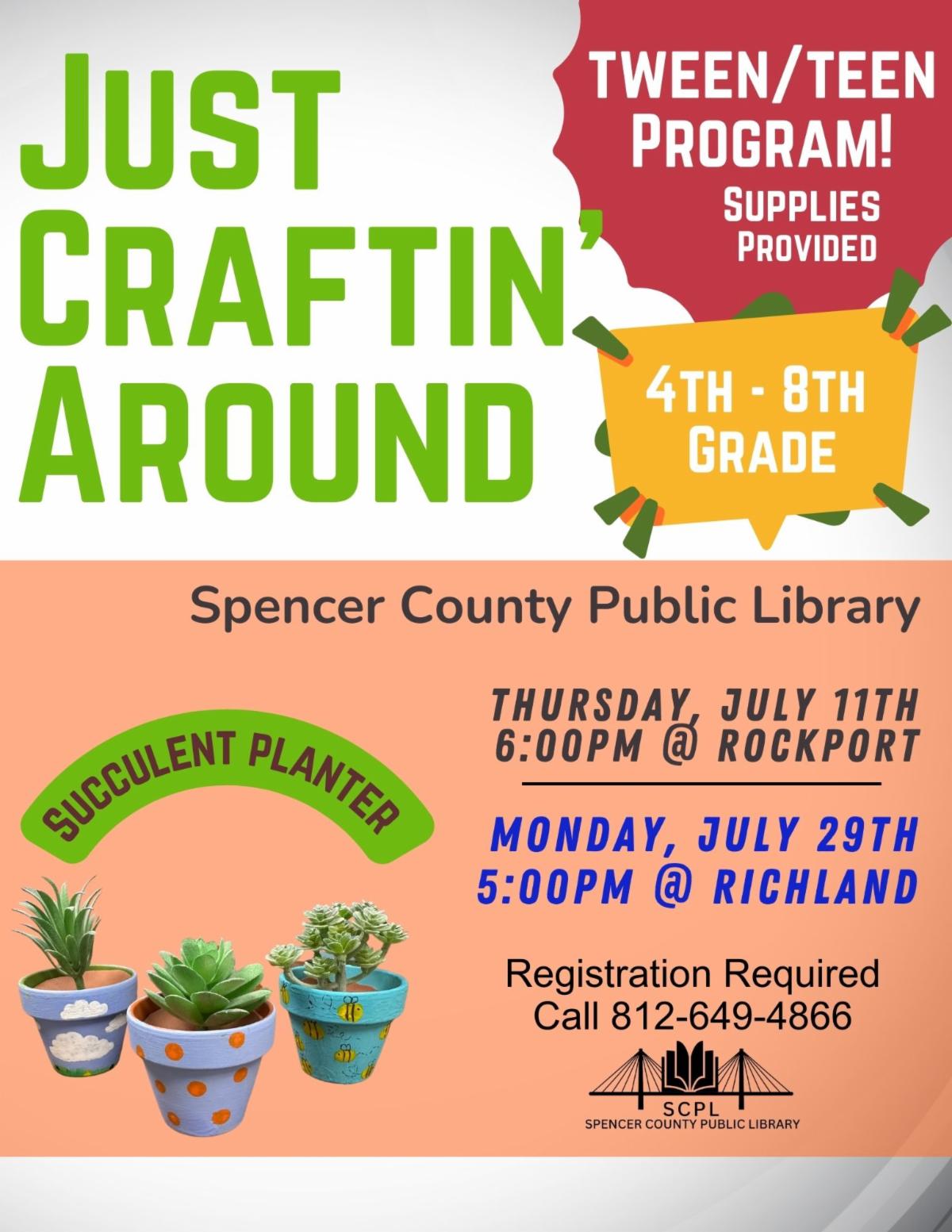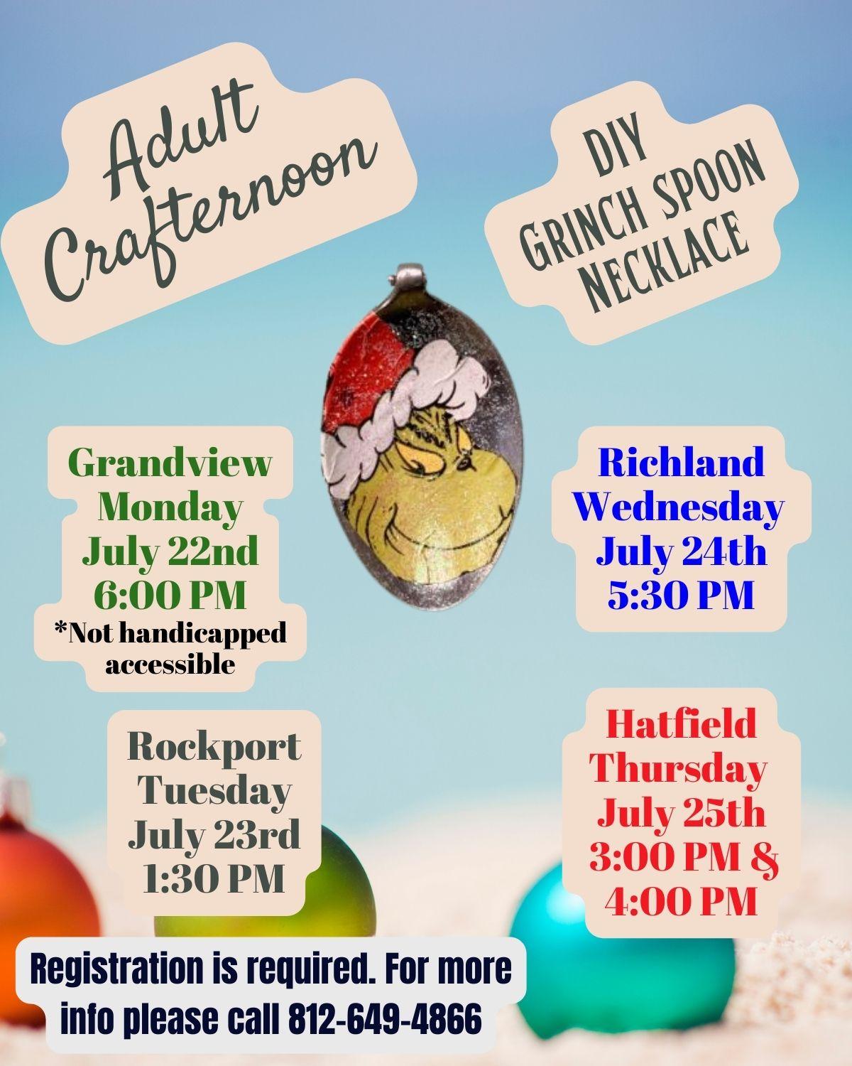 Door Decor and Adult Crafternoon will not be offered in August. Adult Crafternoon will resume in September along with a new craft program that will replace Door Decor. | |