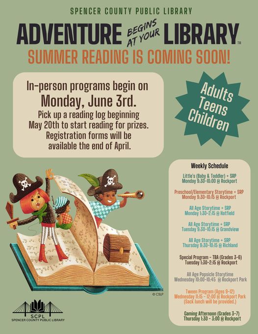 Adventure awaits at your library this summer! Mark your calendars, gather your fellow explorers, and get ready for a season of reading, discovery, and fun. Stay tuned for more details and updates in future newsletters and on Facebook.