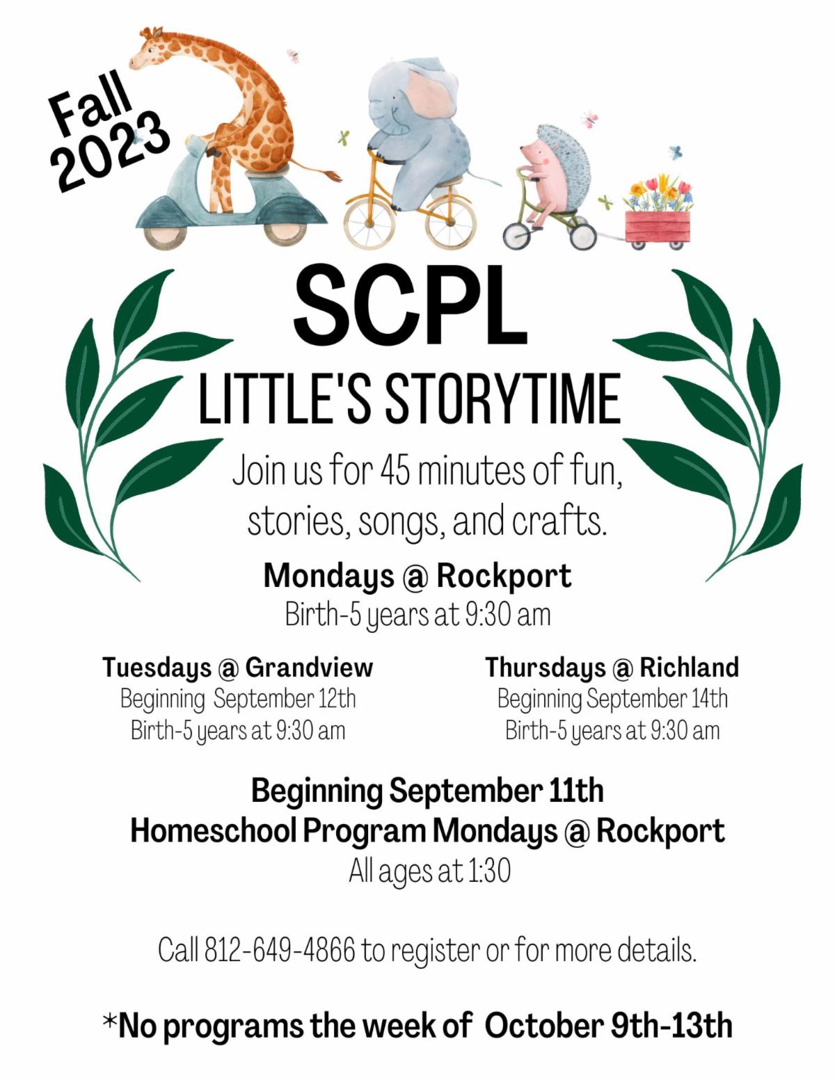 Do you have a baby, toddler, or preschooler? If so, join SCPL's 1000 Books Before Kindergarten program to help your child be ready for school. This program promotes reading to newborns, infants, and toddlers and encourages parent and child bonding through reading. The goal of the program is to establish strong early literacy skills that will allow children to gain the confidence to become strong readers. There are 1,824 days between birth and turning 5 years old. That is less than 1 book per day! Contact our Children's Department or Click here for more information.