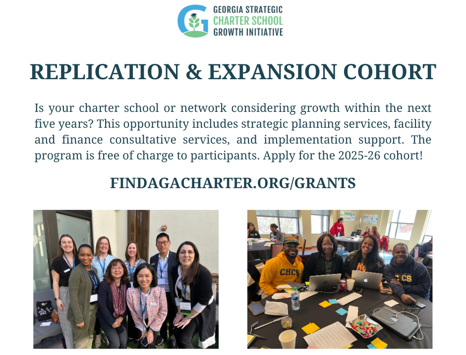 | We are looking for our next cohort of charter schools for the Replication & Expansion Cohort Program. All existing Georgia charter schools are eligible to apply. Learn more and apply online at FindaGaCharter.org/grants. Applications must be submitted by 10:00 a.m. ET on Wednesday, June 25, 2025. Contact Molly Gassman, with questions. | |