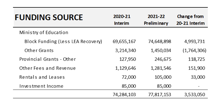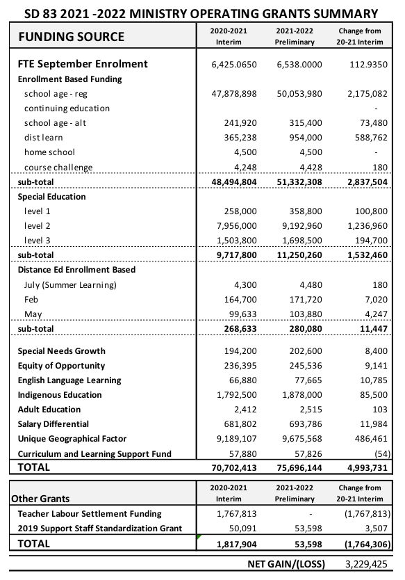 Labour settlement funding for teachers has been rolled into block funding for 2021-22. The over-all impact of all funding changes will result in an expected increase of $3,229,425 in funding from the Ministry of Education for 2021-22.