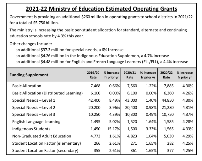 As announced on March 12, 2021, the Ministry of Education’s Operating Grant block funding rates will change as follows: