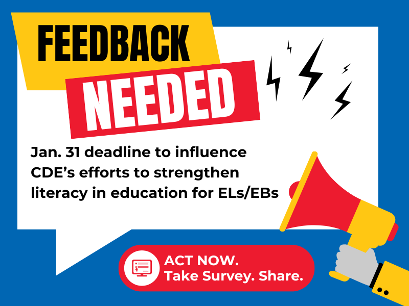 YOUR FEEDBACK IS NEEDED BY JAN. 31. Please fill out the CDE Literacy Landscape Survey by January 31, 2024. Share with your network and help us lift up English Learner/Emergent Bilingual education in the "comments and/or concerns" section. CDE's effort to learn what is happening in the field is an important element as California works to strengthen literacy education. Your input is crucial to help them recognize and respond to multilingual needs and reality in language and literacy education in California. CLICK HERE