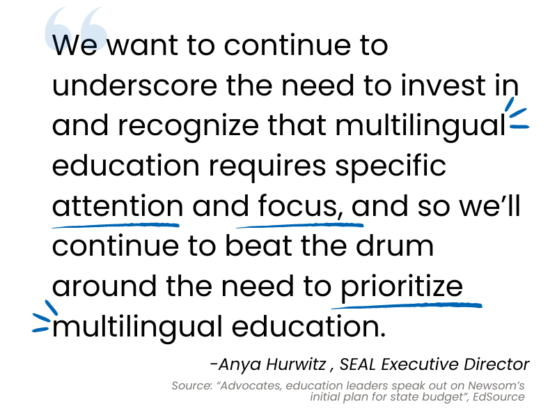 PERSPECTIVES FROM THE FIELD. Governor Newsom recently presented his 2024-2025 state budget proposal. It included his solutions to cover the budget shortfall including how to protect education investments. EdSource asked California education leaders and advocates - including SEAL's Executive Director Anya Hurwitz - to share their initial thoughts. From SEAL to Californian's Together, EdTrust West to Superintendent Tony Thurmond, CLICK HERE to hear from diverse perspectives. | |