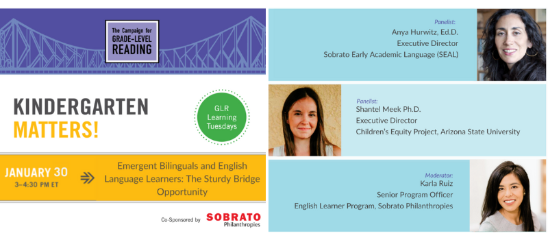 KINDERGARTEN MATTERS! On January 30, join the Campaign for Grade Level Reading, Sobrato Philanthropies, Children's Equity Project and our very own Executive Director Anya Hurwitz, for a timely and important conversation as we delve into strategies that contribute to creating the most conducive classroom environment for emergent bilinguals’ success in kindergarten! We’ll discuss mitigating the risks associated with high absence rates within the community and ensuring that every emergent bilingual student has the opportunity to thrive academically. REGISTER TODAY!. | |