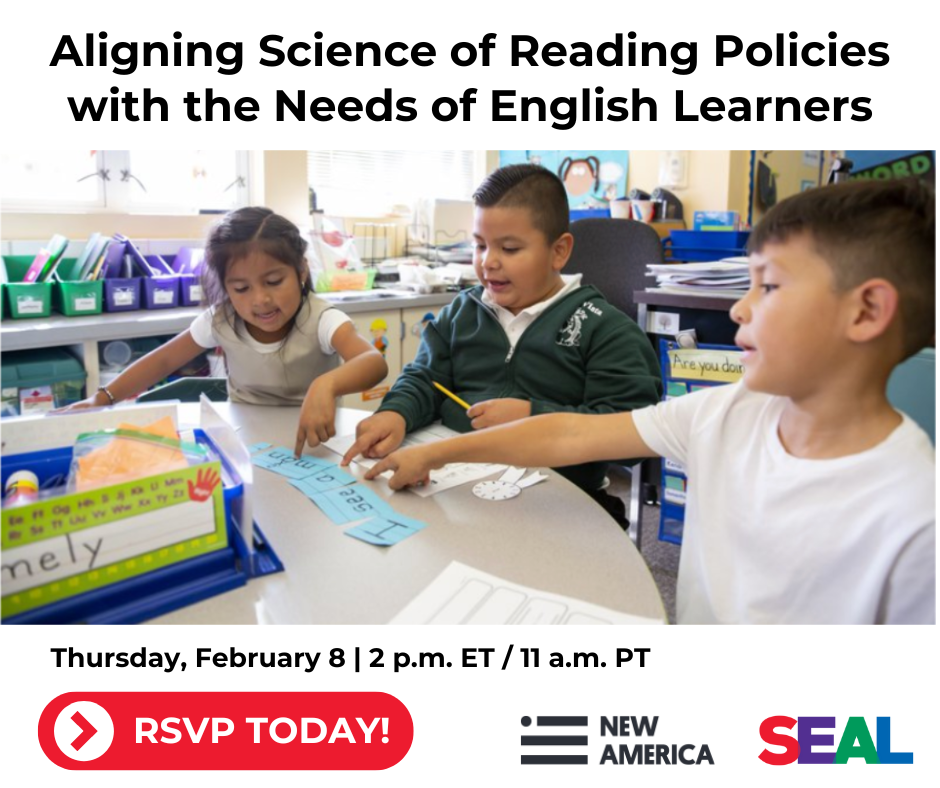 UNPACK THE RELATIONSHIP BETWEEN SCIENCE OF READING AND ENGLISH LEARNERS! In partnership with New America, join us on Feb. 8 for a discussion on this much debated topic, best practices for EL-identified students, and implications for dual language programs. The first panel of experts, moderated by SEAL's Senior Director of Research and Evaluation Martha Martinez, will discuss policy implications for ELs and the second panel will feature state, district and instructional leaders at the forefront of Science of Reading implementation. This is not to be missed! RSVP TODAY! | |