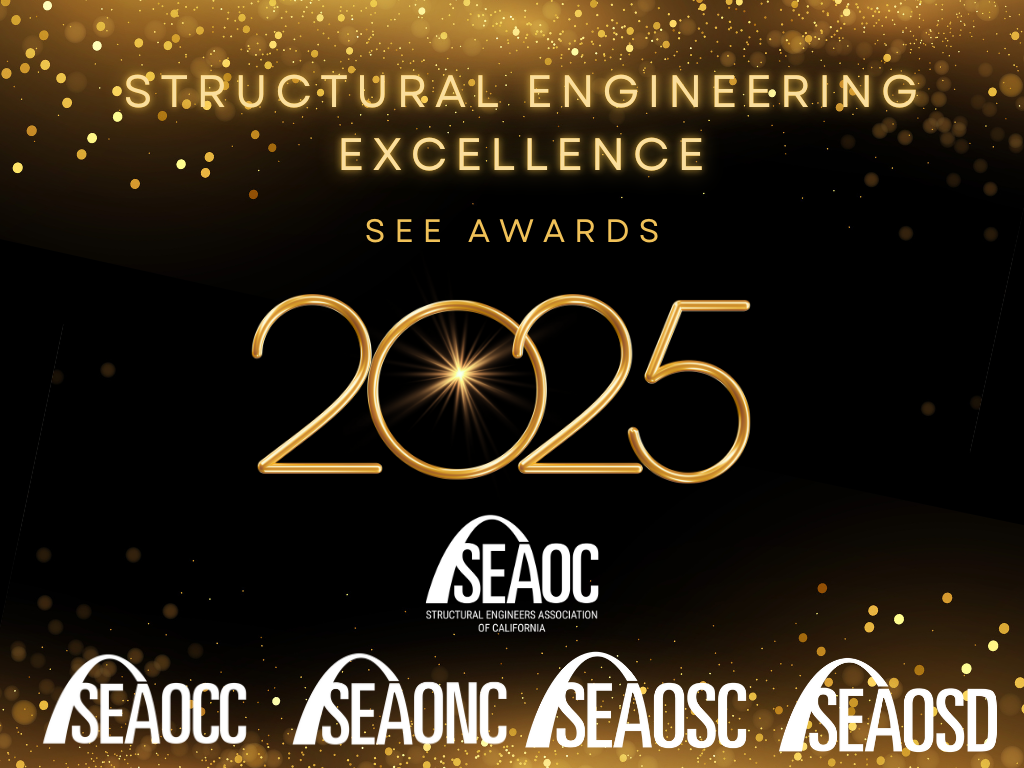The annual Structural Engineering Excellence (SEE) Awards Program celebrates the significant structural engineering achievements. California-based design teams are encouraged to submit eligible projects to the Annual SEE Awards Program for consideration. Entrants will submit their projects to SEAONC, SEAOSC, SEAOCC or SEAOSD, as appropriate per their regional MO affiliation. MO Awards will be recognized during the annual MO Awards ceremony. Projects receiving an Award of Excellence at their MO ceremony will automatically be entered in the SEAOC SEE awards program and recognized at a ceremony at the annual SEAOC Convention.
