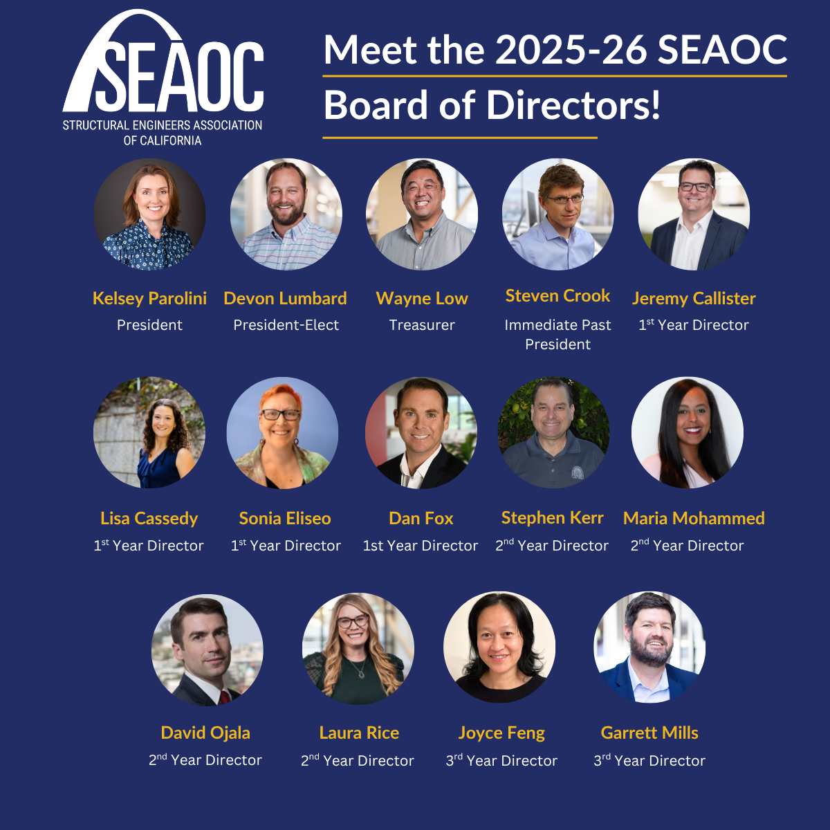 As I step into this role, I’m most excited to listen, learn, and work alongside you to build on SEAOC’s strong foundation, while continuing to evolve how we serve our members and the profession. This year, guided by our mission and values, we’re advancing six organizational priorities: SEAOC 3.0, organizational improvement, continuing education, technical resources, advocacy, and membership. Together, we have an incredible opportunity to strengthen our organization, amplify our collective voice, and continue shaping the future of structural engineering in California and beyond.