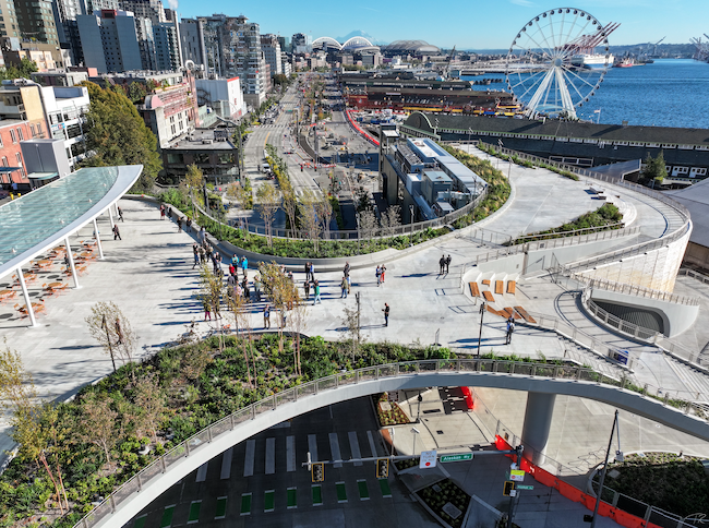 | | Jessica Murphy of SDOT presents on the Seattle Waterfront Program to SEAW and ASCE. Photo by Romulos Ragudos. | | Aerial photo of the new Overlook Walk in Seattle. Photo courtesy Jessica Murphy. | |