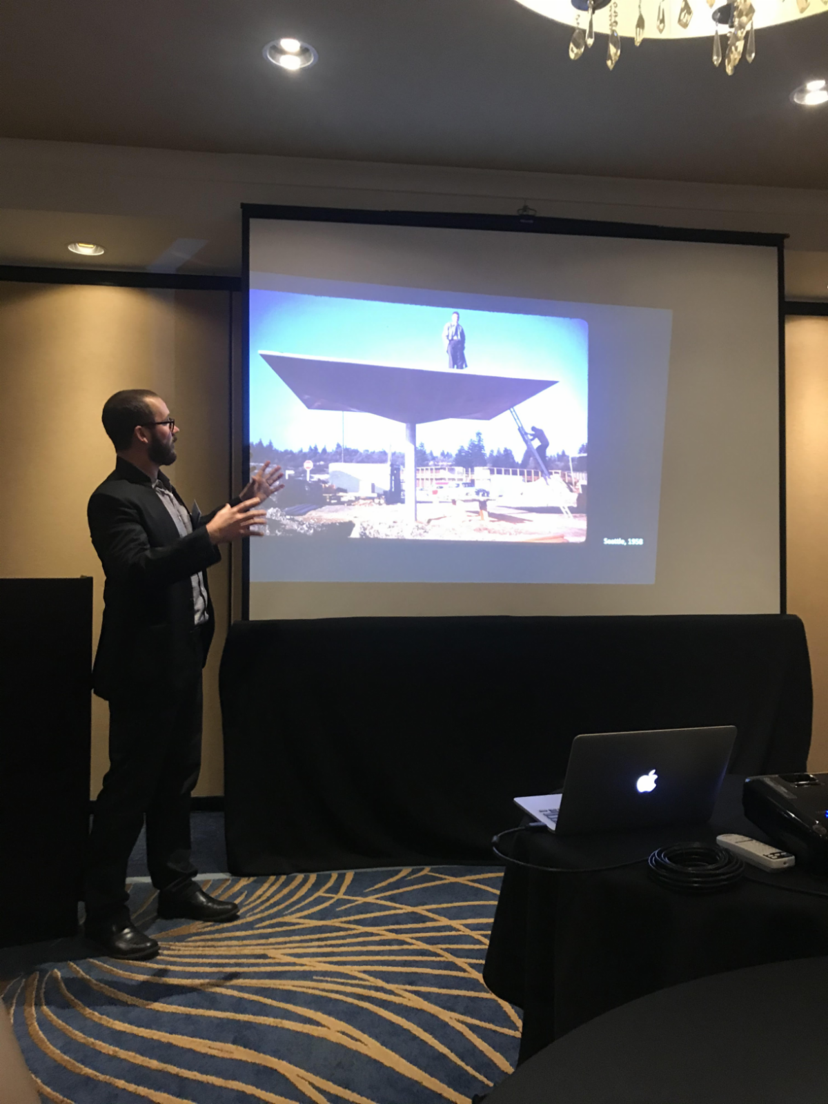 The main presentation was about Tyler S. Sprague’s latest book about the life and work of Jack Christiansen. Tyler is an Assistant Professor in the Department of Architecture at the University of Washington. His book captures Jack’s significant contributions to the modernist architecture and engineering of the Pacific Northwest. As a named partner of Magnusson Klemencic Associates, previously known as Skilling Helle Christiansen Robertson, his work in thin-shell concrete reached new levels of material efficiency, long-span capability, and architectural expression, vaulting him into the pantheon of global shell designers with Felix Candela and Heinz Isler. Inspired by Northwest topography and drawn to the region’s mountains and natural landscapes, Jack employed hyperbolic paraboloid shapes, barrel-vaulted structures, and efficient modular construction to echo and complement the forms he loved in nature. Jack’s crowning structural feat was the Kingdome roof, which, at 660 feet in diameter, was the largest concrete dome in the world. The structure took pride in being efficient due to its circular frame and thin roof. The outdoor ramps served double duty as braces for the vertical columns. Christiansen went on to develop some 75 thin-shell projects, including public schools, gymnasiums, and sculptural church spaces. To close the presentation, Tyler talked about the exhibit he has staged at the University of Washington highlighting the work of Jack Christiansen.