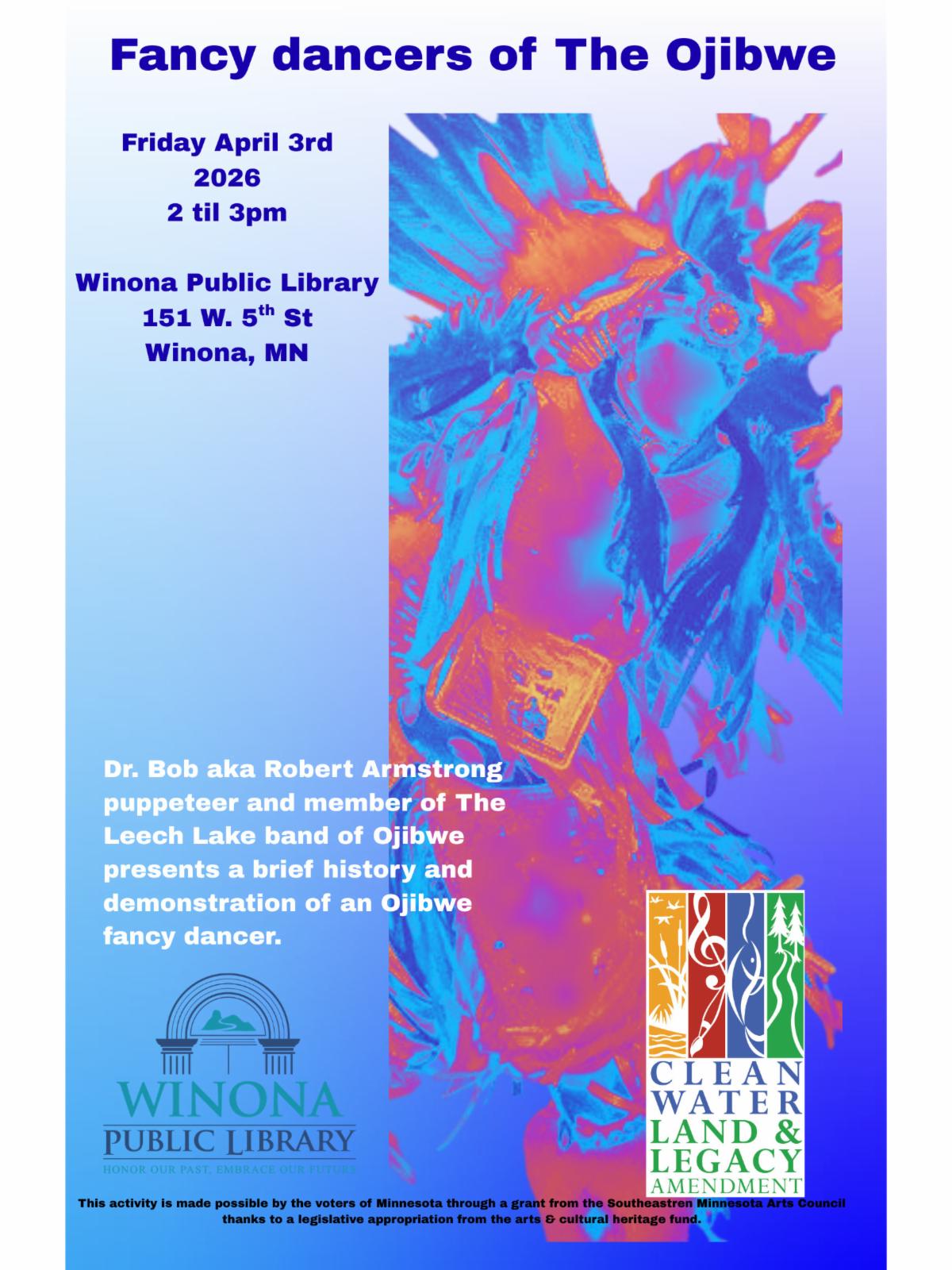 Join Robert Armstrong, master puppeteer and member of the Leech Lake Band of Ojibwe, as he presents a brief history of pow wow gatherings and fancy dancers. Robert will demonstrate a marionette fancy dancer puppet that he has created. This free public event will be followed by a short Q&A.