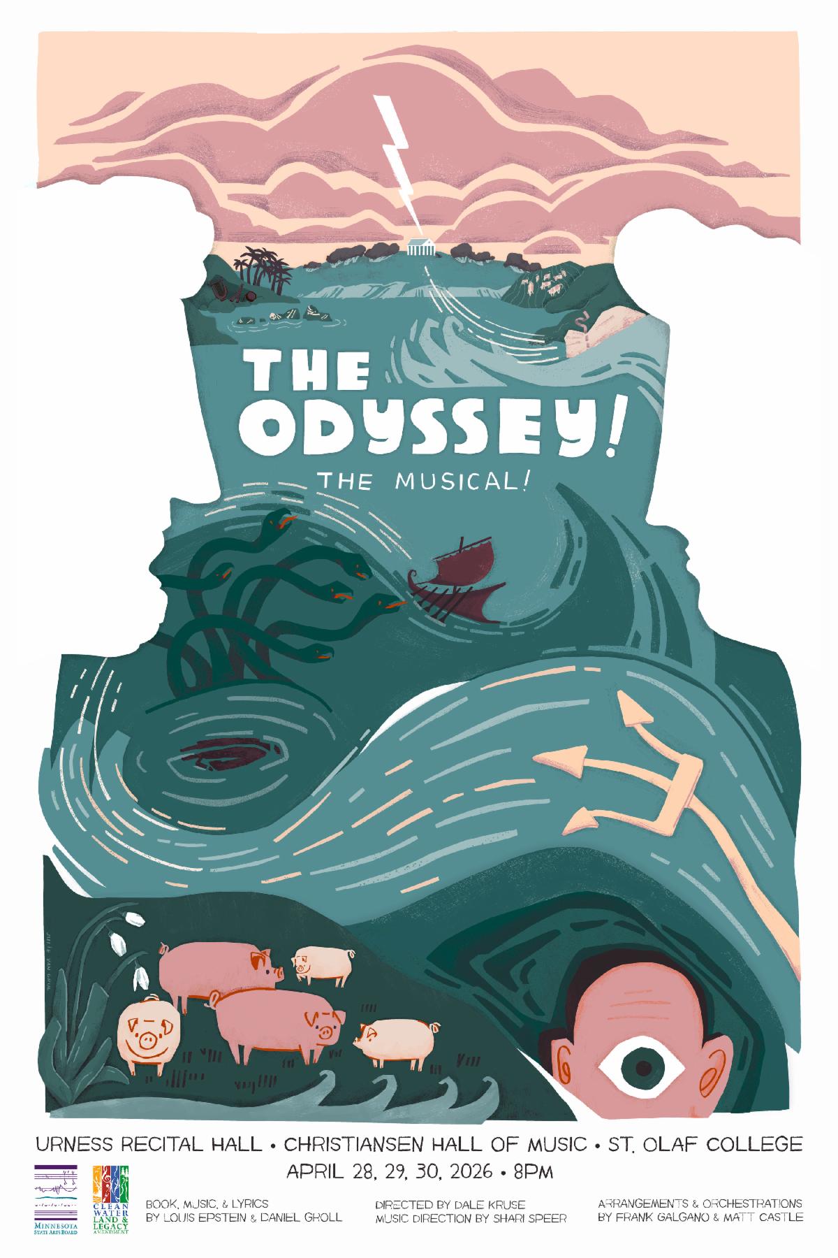 St. Olaf students and faculty present the world premiere of The Odyssey! The Musical!, an original musical comedy adaptation of the timeless Homeric epic by Louis Epstein and Daniel Groll. A blend of Broadway musical, concept album, Disney fairy tale, and operetta, The Odyssey! The Musical! explores themes of love and loss, deviousness and triumph, and the foibles of human nature. Kids, tweens, college students, adults, and even Classics scholars will find something to love in this sometimes riotous, sometimes heart-wrenching, always gripping story about the obstacles we overcome to make our way home.