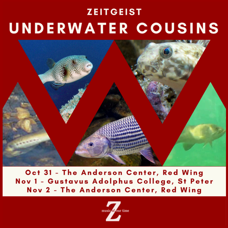 Zeitgeist presents the world premiere of Underwater Cousins, a captivating multi-movement work by Northfield composer JC Sanford that invites audiences beneath the surface to discover the surprising complexity of fish. Inspired by Jonathan Balcombe's book What a Fish Knows, this innovative piece celebrates individual fish as sentient beings with unique personalities, from the mathematically gifted African tigerfish to Elvis, a sociable smallmouth bass. Through music, images, and narration by Mia Kakitani-Sanford, the performance reveals the intelligence, cooperation, and artistry of our aquatic cousins. The program also features Randy Bauer's Holding Patterns, a kinetic exploration of shifting rhythmic patterns. This collaboration encourages listeners to reconsider humanity's relationship with the underwater world and envision a future of mutual respect and empathy.