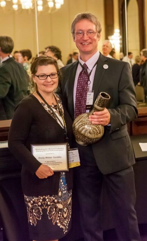 Former SEMC President, Mike Hudson presents Emily Wilder Santillo with the 2013 SEMC Emerging Museum Professional Award. This award recognizes emerging professionals who have demonstrated excellence and leadership in museum activities at his or her institution, within the museum profession as a whole, and especially in the southeast region.