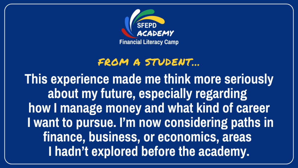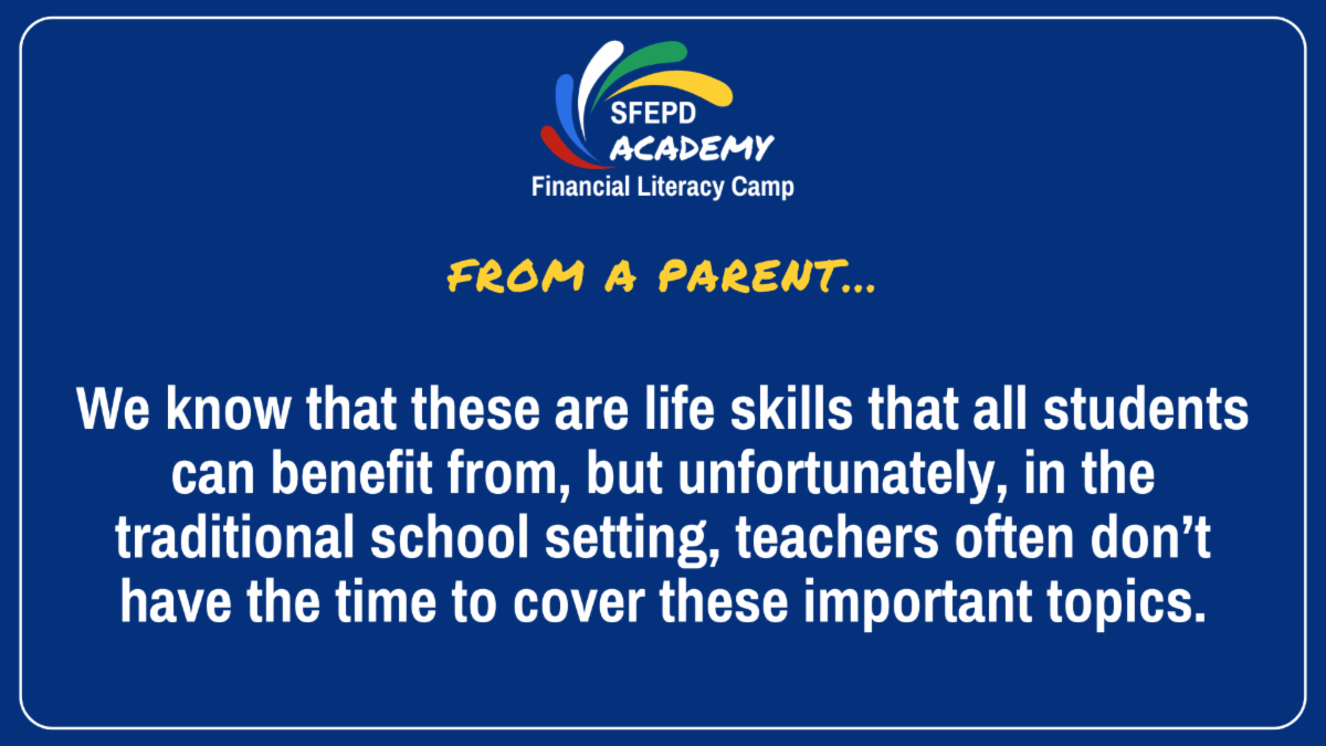 The fourth annual SFEPD Academy took place from July 21-25, offering high school students a dynamic virtual experience focused on financial literacy and professional development. Students from 10 states and an international student from India came together to participate in group and individual challenges that broadened their horizons and boosted their financial knowledge.