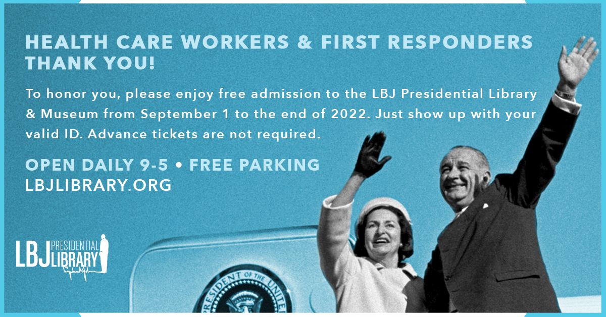 The LBJ Presidential Library and Museum is offering free admission to any worker at hospitals, clinics, doctor offices, fire, police, EMS, and pharmacy personnel from September 1 through the end of 2022. Just show up and present a valid ID. Advance tickets are not required.