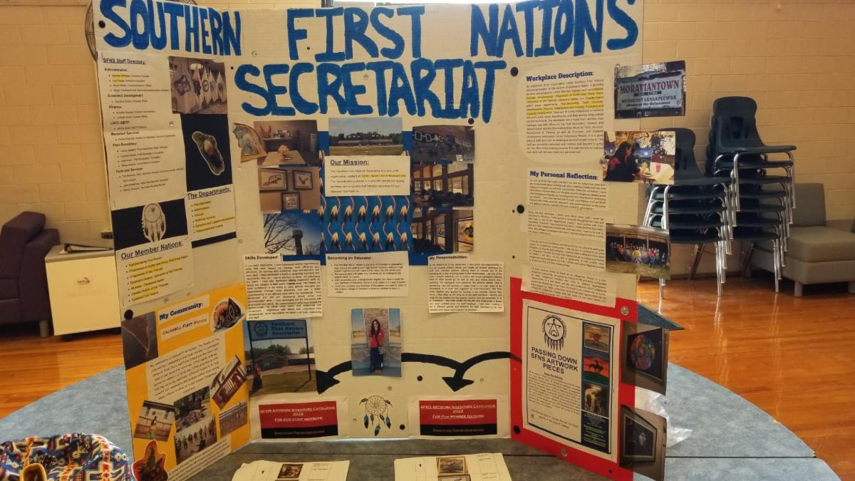 Aanii-Boozhoo! I am Daveigh Fletcher, a grade 12 student at West Elgin Secondary School, and I took my co-op placement at the Southern First Nations Secretariat (SFNS) from March 1, 2023 to the end of June 2023. For our Independent Study Project in the co-op course, we were given a series of different options, such as a co-op fair, presentation, or a commercial video to explain to students what our co-op placements are, their purposes, and the responsibilities we are given. I chose to do a co-op fair, which meant I had to create a tri-fold all about SFNS and my experience throughout the months of being here. I had a booth set up where students came and asked questions about the different departments, different member Nations we service, and what the environment feels like, along with smudging those who were interested.
