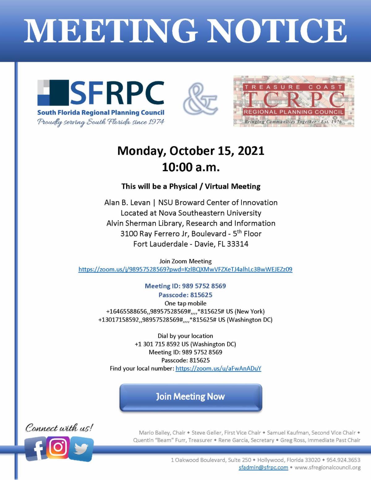 Friday, October 15, 2021 at 10:00 a.m. (SFRPC/TCRPC Joint Meeting @ NSU)