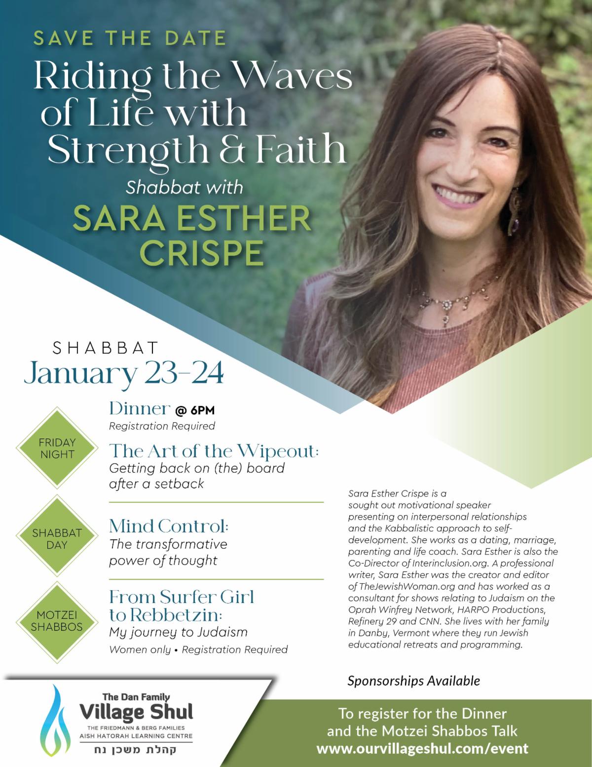 Friday January 23: Shabbat Dinner with Sara Esther Crispe - Click HERE