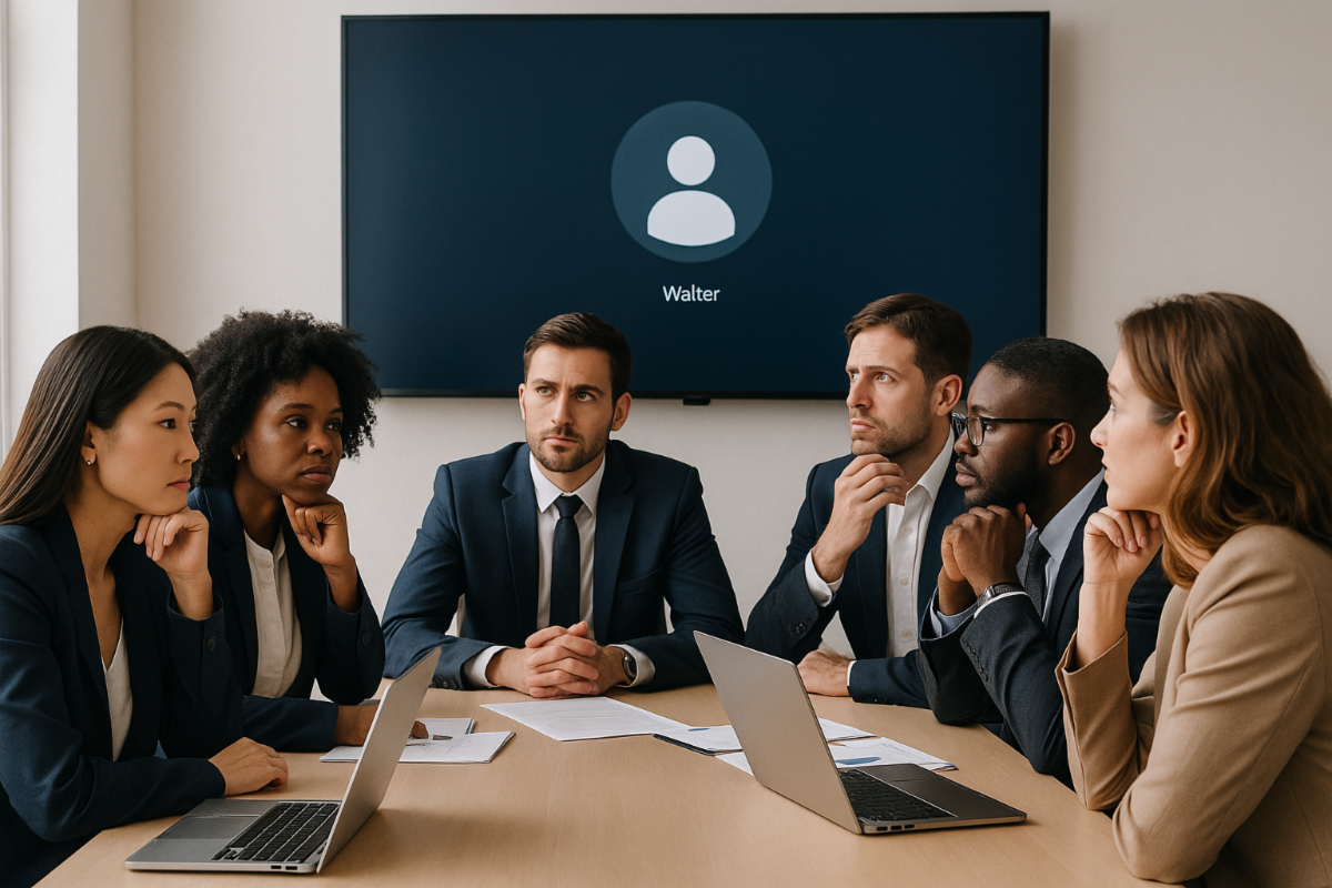 Walter requests a meeting but doesn’t show up. The team waits 10 minutes, unsure how to proceed.