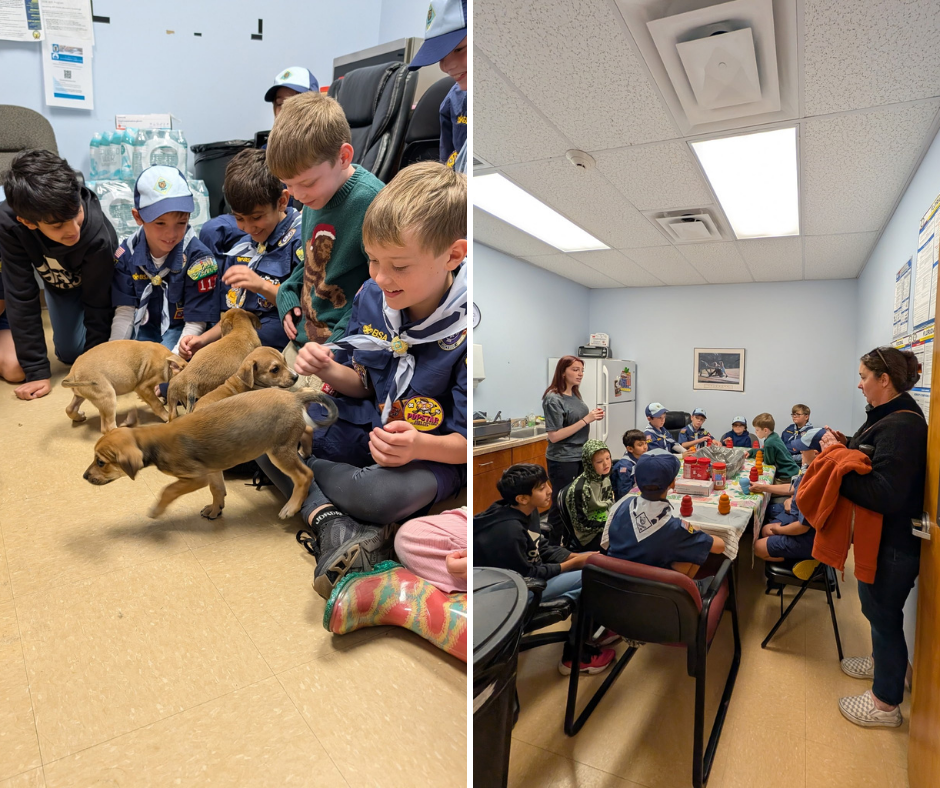 During their visit, the scouts learned about daily animal care and what it takes to keep our shelter pets healthy, safe, and happy. They asked great questions and showed genuine curiosity about how our staff and volunteers help animals while they wait for their forever homes. The scouts also rolled up their sleeves to make enrichment treats, discovering how simple activities can provide mental stimulation and reduce stress for shelter pets. Of course, no visit would be complete without spending time with our puppies who happily soaked up all the attention, cuddles, and playtime.