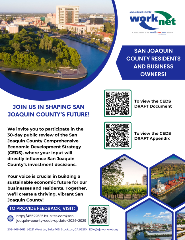 We are excited to invite you to participate in the 30-day public review of the San Joaquin County Comprehensive Economic Development Strategy (CEDS). This is a unique opportunity for you to provide input that will directly influence San Joaquin County’s investment decisions, guiding our path toward a sustainable and prosperous future.