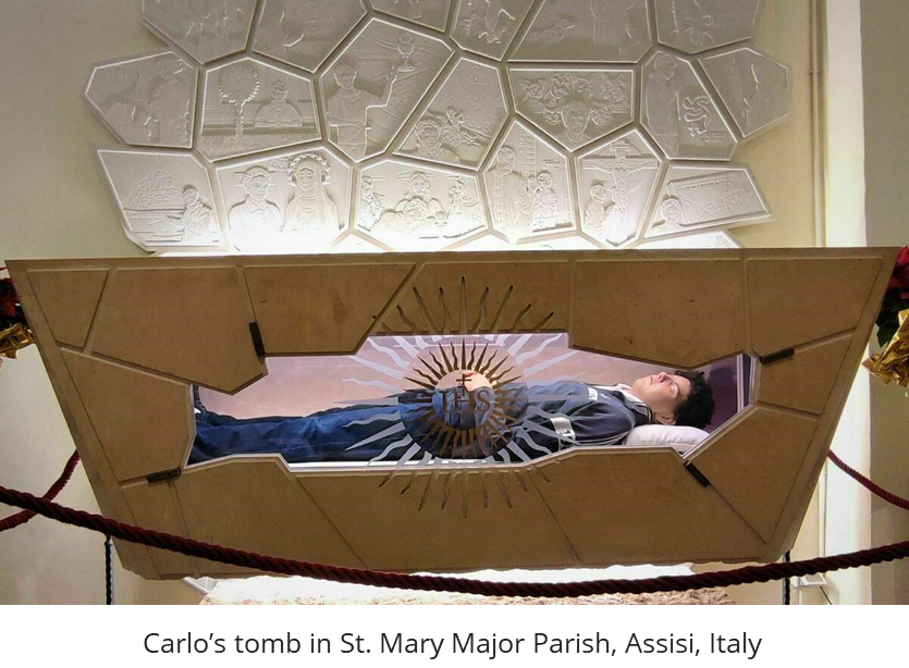 | | On October 4, 2006, the feast day of St. Francis of Assisi, at just 15 years old, Carlo was diagnosed with acute promyelocytic leukemia. Eight days later, he passed away. Carlo emulated St. Francis of Assisi and had requested to be buried in Italy. His cause for canonization was opened in 2013; he was declared Venerable in 2019 and Blessed in 2020 after the first miracle was attributed to his intercession — a Brazilian child was healed of a congenital disease of the pancreas after touching a first-class relic, one of Carlo’s shirts. In 2019, Carlo’s body was exhumed and now lies encased in glass in St. Mary Major Parish, also known as the Shrine of the Renunciation, in Assisi. It is fitting that he should lie in the same place St. Francis of Assisi stripped his clothing to renounce his wealth. There are parallels to the way Carlo also lived a life of radical love, choosing a path that made him so different than others, while still drawing them closer to personal encounters with Jesus through the Eucharist and his witness. In 2022, a second miracle occurred: After a mother prayed at Acutis’ tomb in Assisi, her daughter, a Costa Rican student in Italy, experienced complete healing from serious head trauma she suffered in a bicycle accident.