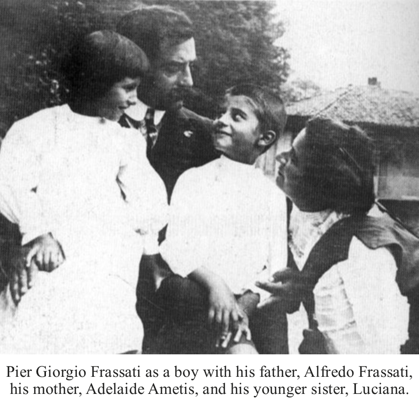 Pier Giorgio Frassati was born in Turin, Italy, on April 6, 1901. His father, Alfredo Frassati, was a prominent member of society as founder of the newspaper, La Stampa, and later Italian ambassador to Germany. His mother was a gifted painter, and he had one younger sister, Luciana. Pier had many talents, but Latin was not among them. In 1913, at the age of twelve, he failed his Latin exams and was sent to Istituto Sociale, a school operated by the Jesuits. At the time, he wrote his father, “I am also sorry that I have to stay behind, and I am ashamed in front of my classmates and my sister who have gone ahead of me.” However, it is because of his time at Istituto Sociale that he joined both the Company of the Blessed Sacrament and the Eucharistic Crusade and began receiving the Eucharist daily, causing his spiritual life to blossom. After a year, he returned to the Italian state school, but in 1917, he again failed his Latin exams and returned to Istituto Sociale to complete his high school certificate.