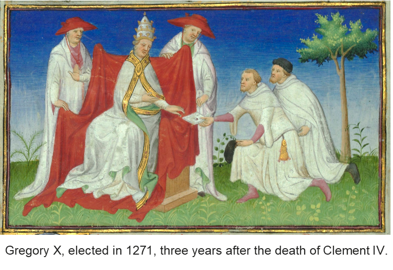 The pope has not always been selected by a conclave, which is literally Latin for “with a key.” After our first pope, Peter, was crucified, Pope Linus was much less ceremoniously selected, followed by Anacletus and then Clement I, and so on for over a thousand years. In fact, until 1330, popes were elected either by a sort of crowd-cheering contest or by a group of clergy members in collaboration with influential families. In 1268, Clement IV died, and the cardinals faced a deadlock vote for three years. In frustration, the people devised a plan to lock the cardinals in the Palazzo dei Papi in Viterbo, north of Rome, until a decision could be reached. The cardinals were fed bread and water through windows and only reached a decision after the roof was removed to “let the Holy Spirit in.” Gregory X was finally elected in 1271, and it was he who formalized the conclave as part of the foundation of selecting a pope in 1274. Since 1492, the conclave has occurred in the Sistine Chapel.