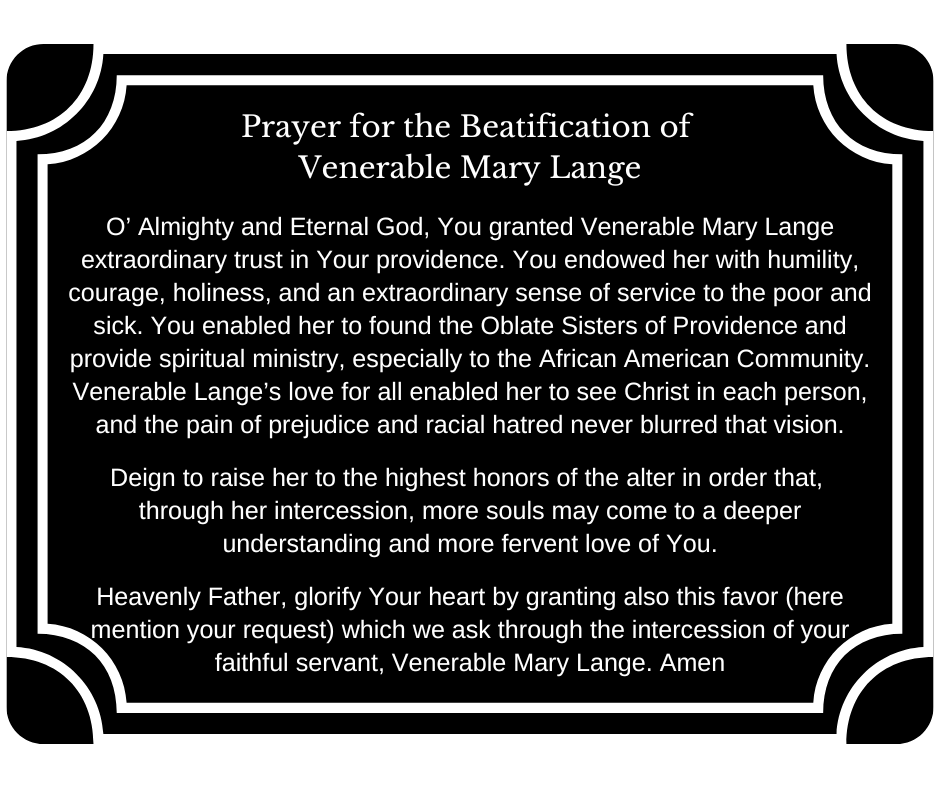 Mother Mary Lange passed in 1882, following a long life of service. Her legacy is present in schools and buildings in the City of Baltimore from Fells Point to the near west side of downtown, and in the work of the Sisters of Providence eventually spreading throughout the United States and abroad. Mother Lange showed amazing holiness in her courageous commitment to teach the enslaved when it was illegal to do so and caring for the sick during the cholera outbreak in Baltimore. What drove Mother Mary Lange was an unwavering faith in God, and the belief that she was to be in this place and this time, and to be of service to others. She lived a life of faith that is worthy of Sainthood.