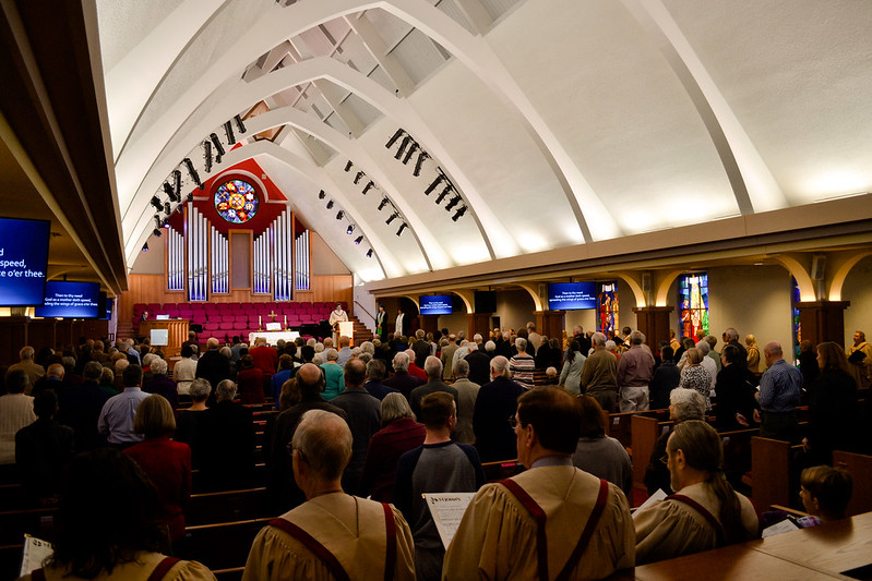 8:15 am, 9:30 am, 11:00 am in sanctuary with choir, brass, and organ.