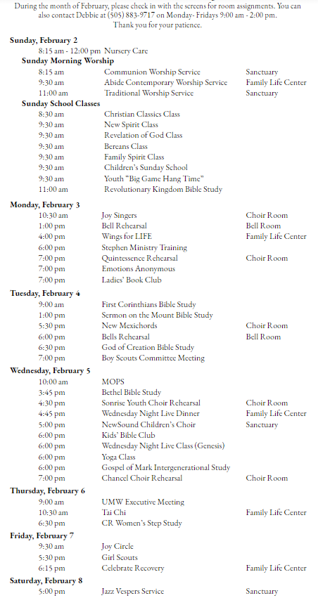 . During the month of February, please check in with the screens for room assignments. You can also contact Debbie at (505) 883-9717 on Monday- Fridays 9:00 am - 2:00 pm. She will also record an outgoing message with room assignments.