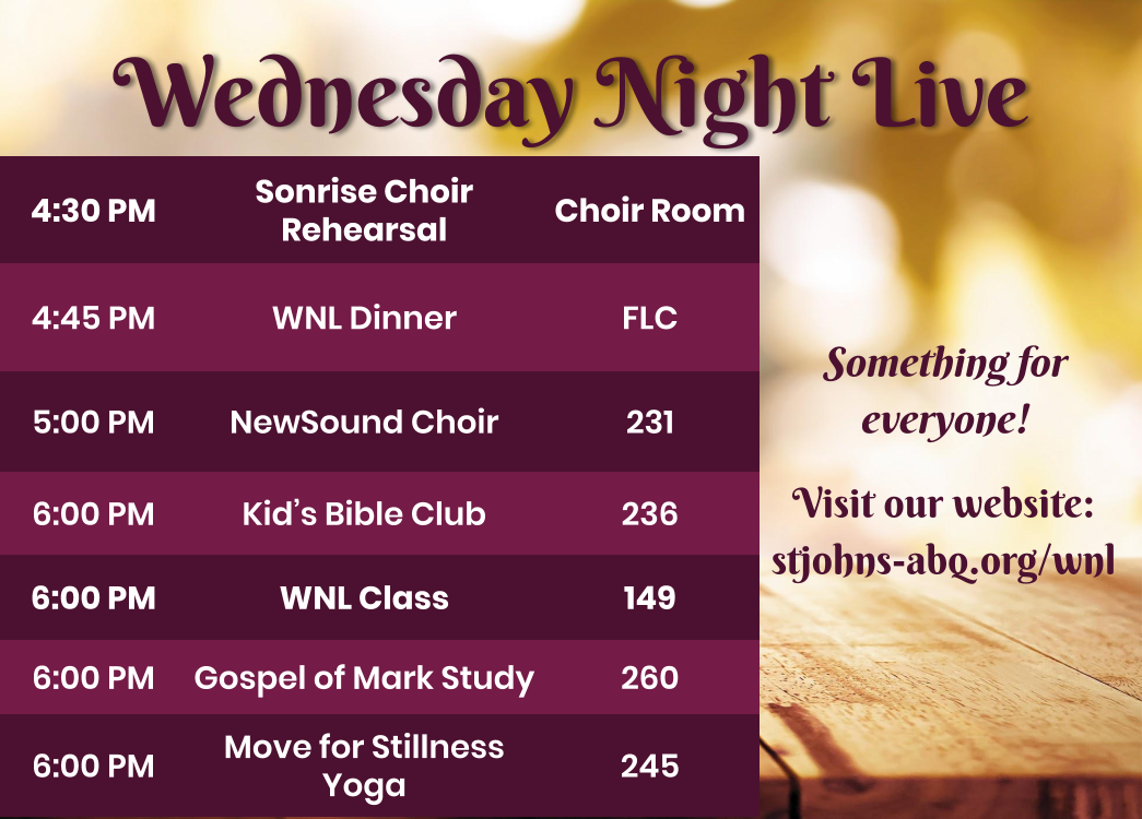 NewSound Children’s Choir takes place in room 231 from 5:15 - 6:00 pm. Kids’ Bible Club occurs from 6:00 - 7:00 pm. We will learn about our Bible heroes! Contact Therese at tmacali@stjohns-abq.org.