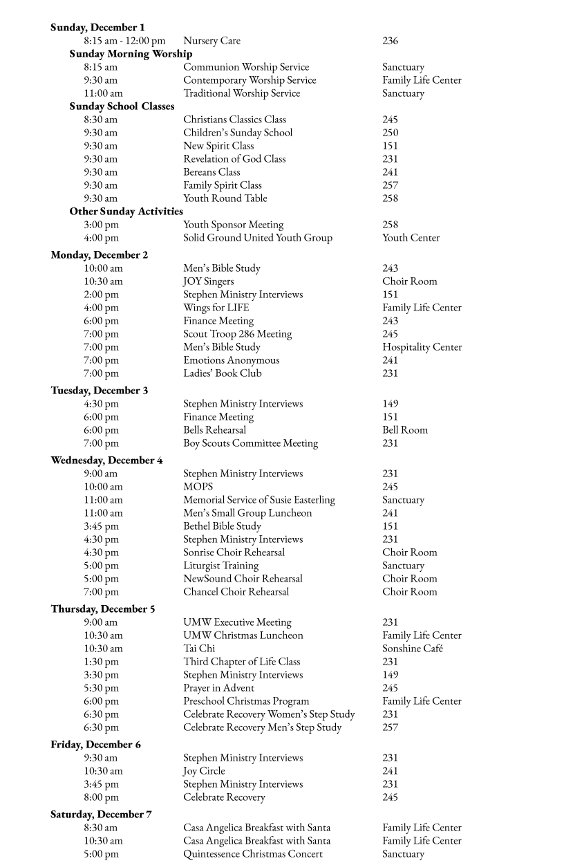 All ladies of the church are invited to attend the annual UMW Christmas Luncheon on Thursday, Dec. 5. We'll begin our festive program at 10:30 am in the Family Life Center. Lunch, served by Chef Tim, will consist of a chicken entree, salad, fruit, and dessert, at a cost of $12 per person. You need not be a member of UMW to participate, so please make your reservation, today. Guests and spouses are also invited. Reservations are required by contacting Beth Cudney at randbcudney@gmail.com or 821-8605, by December 1. Payment may be made on the day of the luncheon. We hope you'll join us for this time of food, fun, and fellowship!